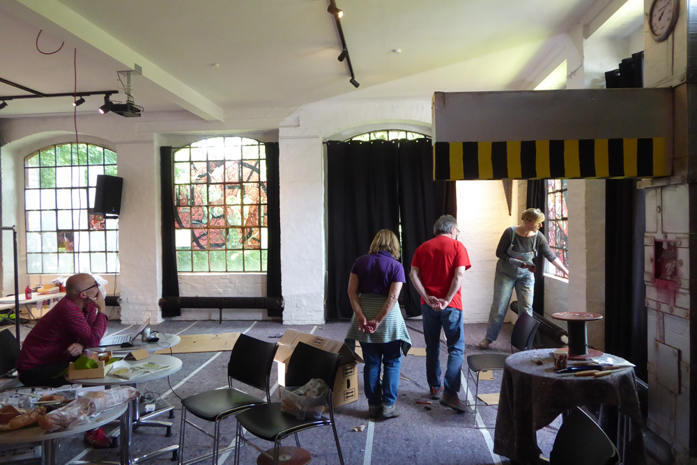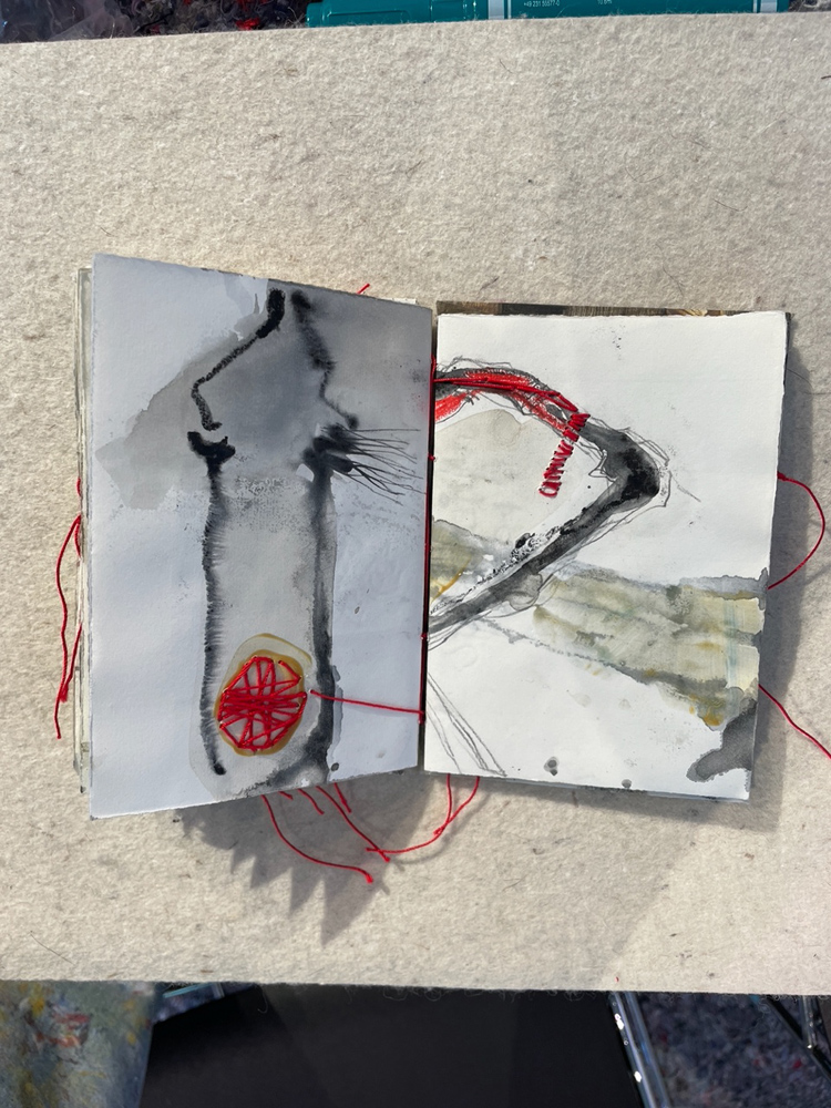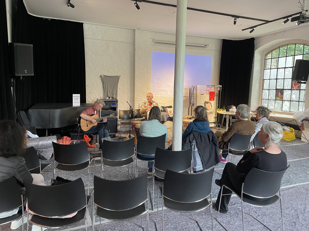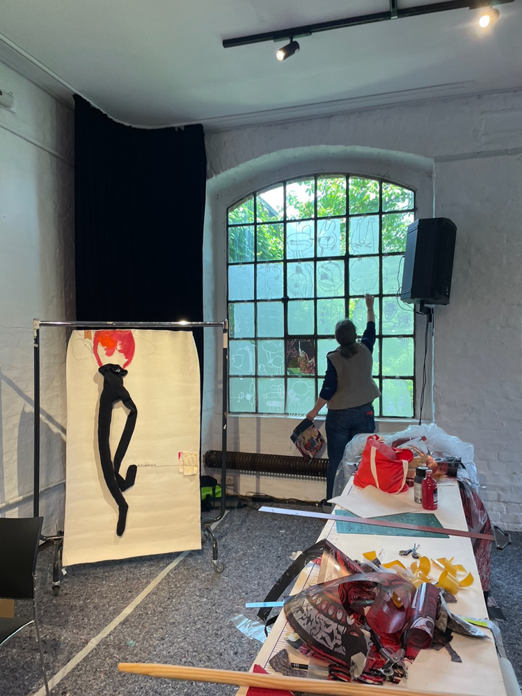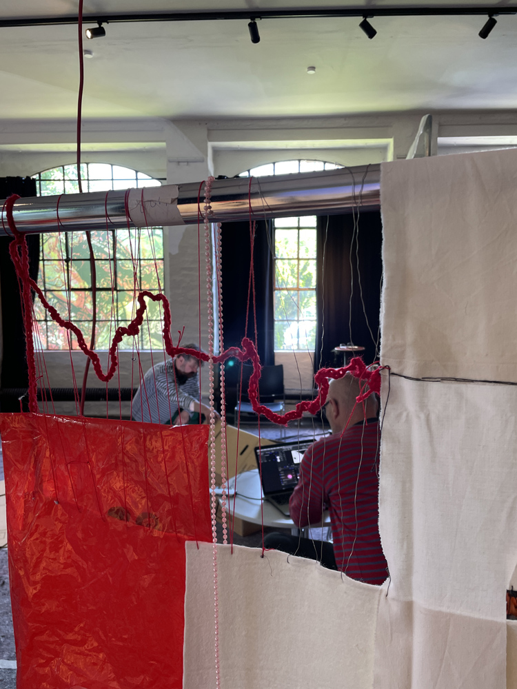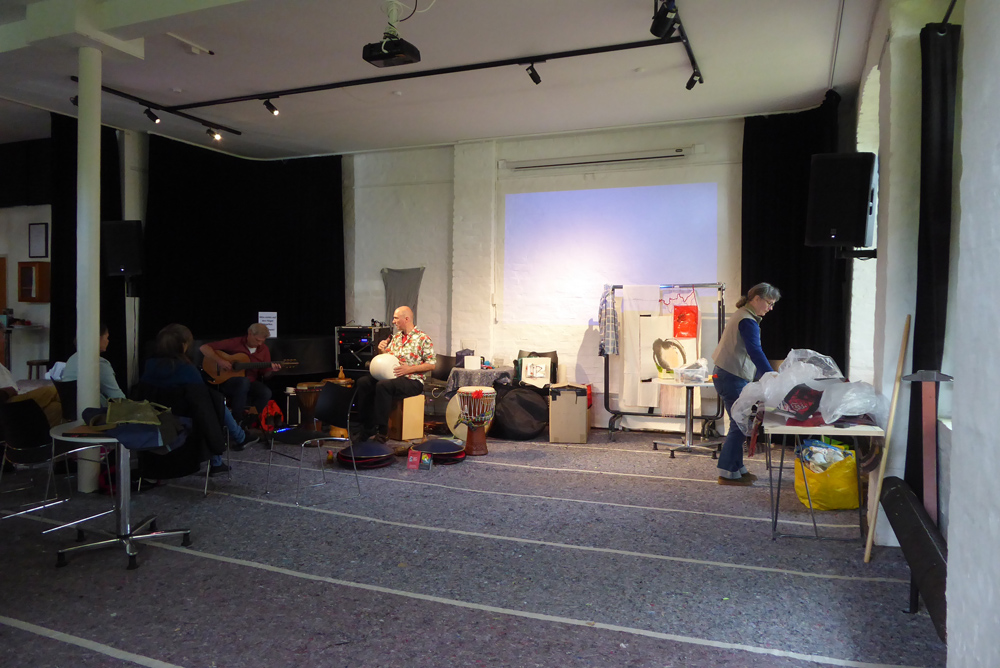 Die Besucherströme nehmen zu, das randloses Alle-machen-mit-Buch füllt sich zusehends, textile Arbeiten in Kleiderständern werden für Tanzmomente umrandet.
